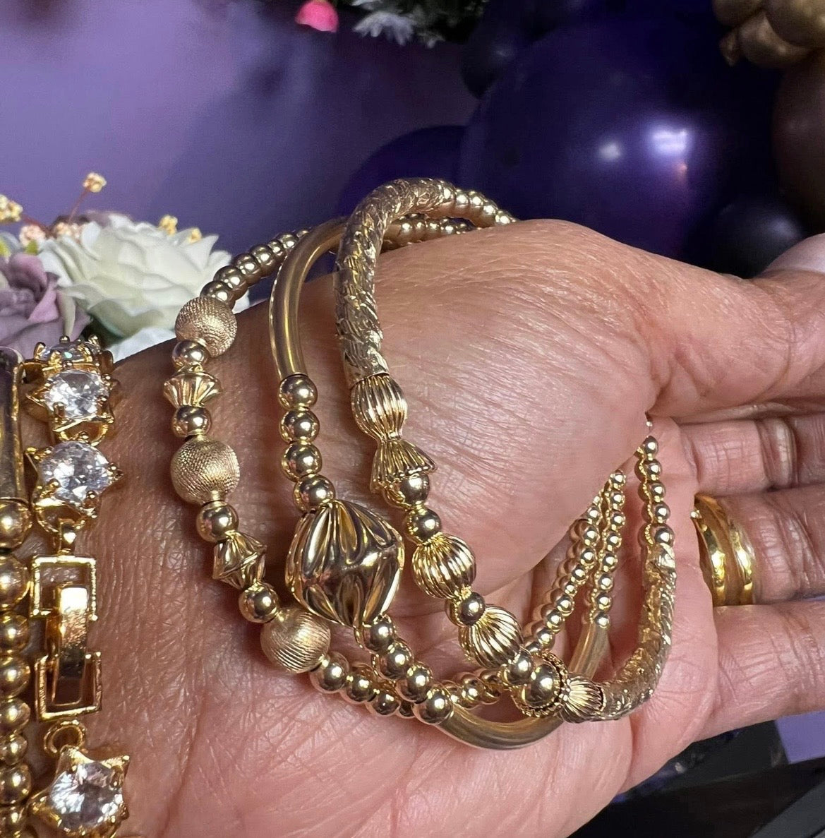 Set includes 3 includes 1 gold filled beaded bangle and 2 simple style flexi bracelets